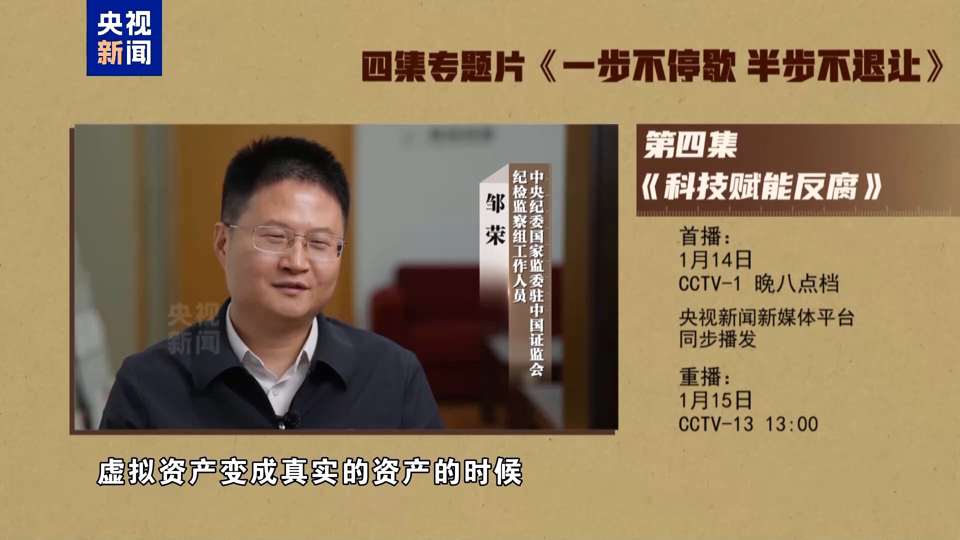 电视专题片《一步握住歇 半步不退避》第四集《科技赋能反腐》,敷陈纪检监察机关丰富防治新式贪污和隐性贪污灵验方针,以信息化赋能正风反腐,充分诈欺科技技能精确发现歪门邪道和贪污问题思绪、赶紧灵验冲破案件,遵循升迁贤人反腐、科技反腐水平。总台央视抽象频说念1月14日晚8点档播出,央视新闻新媒体平台同步播发。